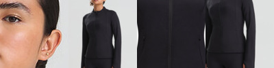 Slim fit. Four-way stretch fabric. Wicking, quick-dry fabric. Zipped pockets. Thumbholes on sleeves. Made with recycled polyester. Tear-away label.