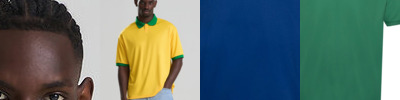 Relaxed fit. Contrast knitted collar. Tear-away label. Wicking fabric. White/Navy and Red/White options have retro-patterned printed fabric. Set-in sleeve.