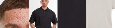 Oversized fit. Dropped shoulders. Polo collar with two-button closure.